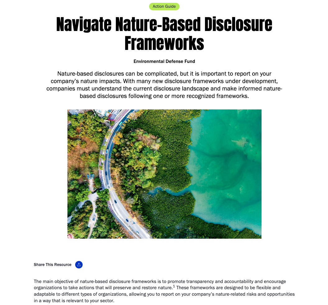 Las divulgaciones relacionadas con la naturaleza pueden ser complicadas, pero es importante informar sobre los impactos de su empresa en ella. Utilice este recurso para comprender los conceptos básicos y el panorama actual de la divulgación, así como también cómo realizar divulgaciones informadas basadas en la naturaleza siguiendo uno o más marcos reconocidos.