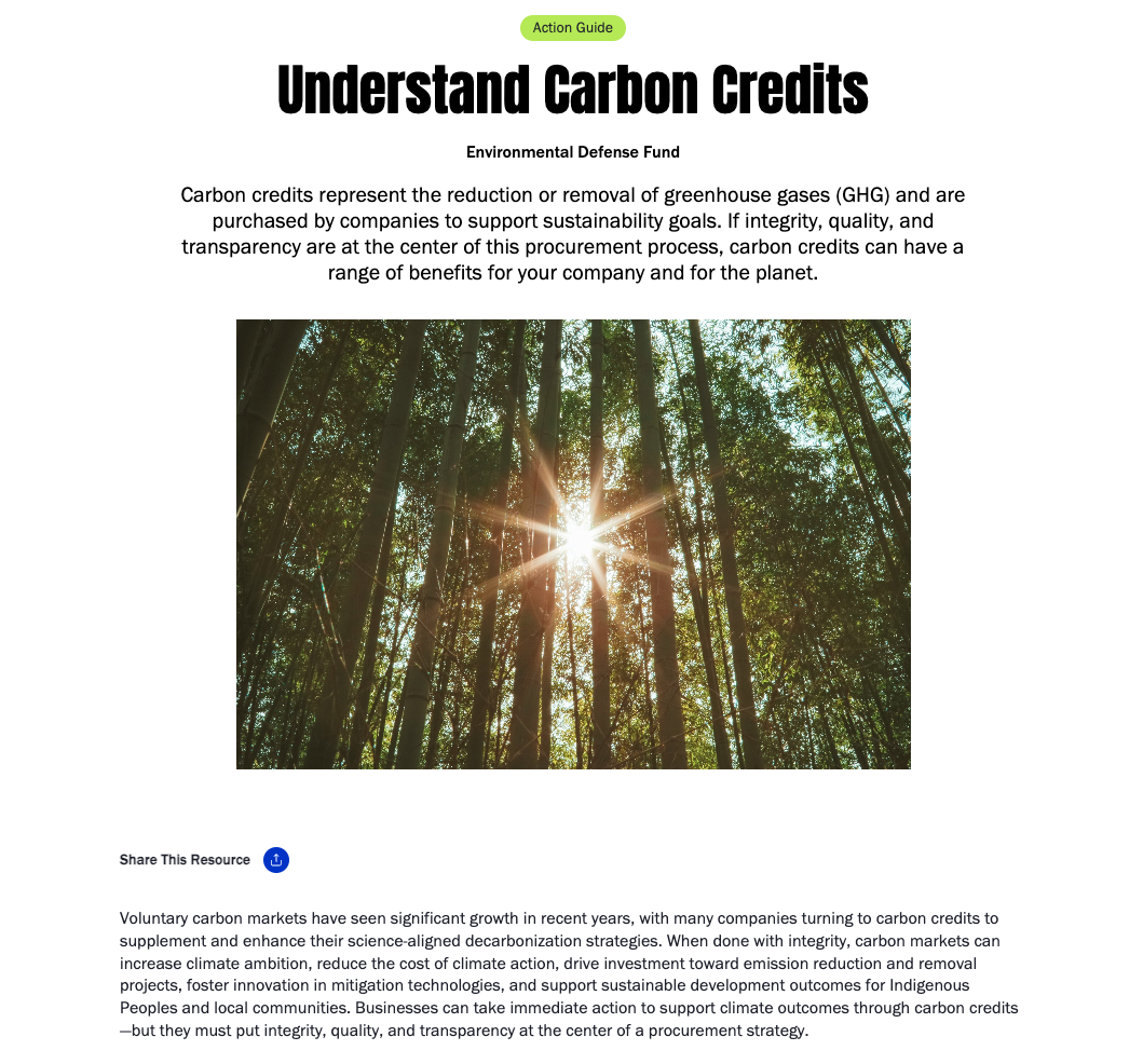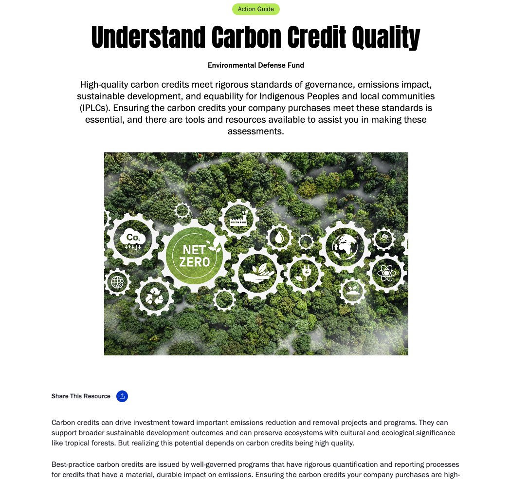 Los créditos de carbono de alta calidad cumplen con rigurosos estándares de gobernanza, impacto en las emisiones, desarrollo sostenible y equidad para los pueblos indígenas y las comunidades locales (IPLCs). Sigue este recurso para asegurarte de que los créditos de carbono que compra tu empresa cumplan con estos estándares.