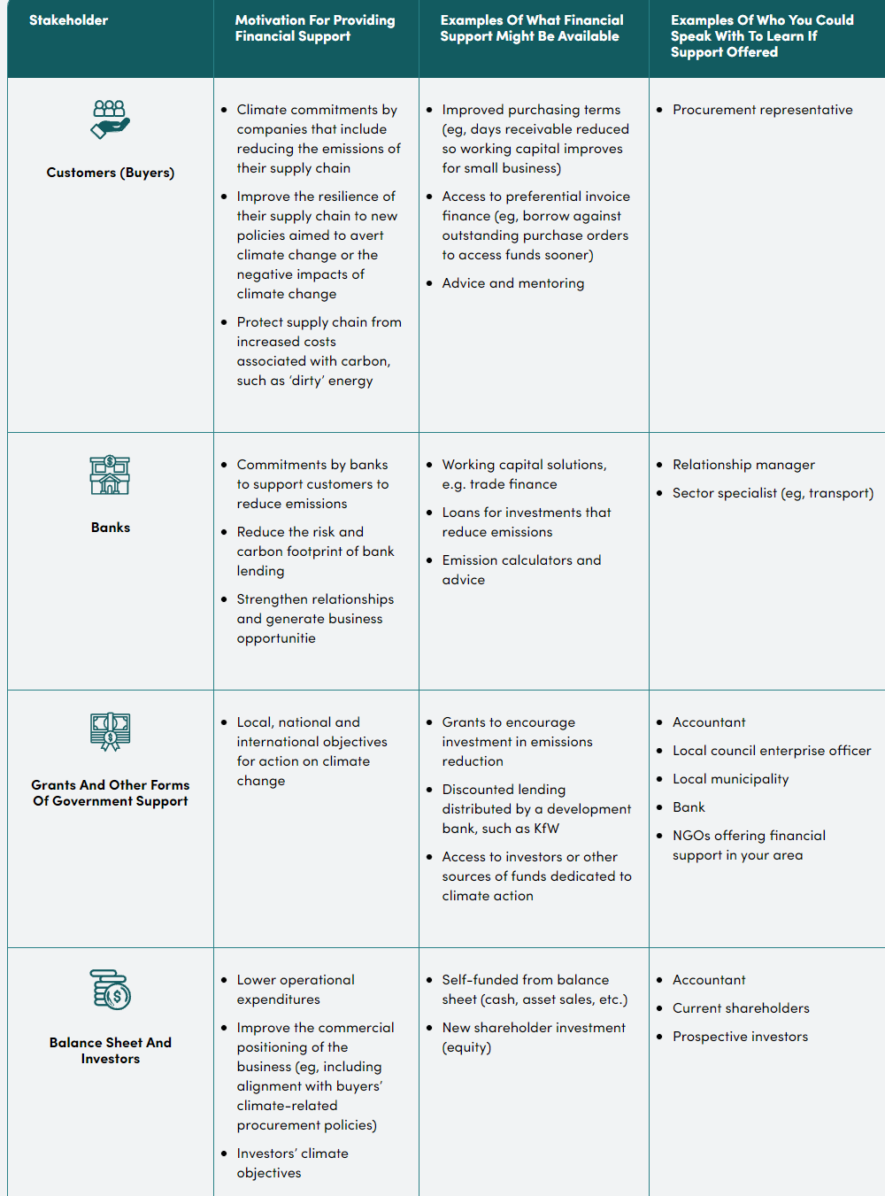 | Stakeholder | Motivation for providing financial support | Examples of what financial support might be available | Examples of who you could speak with to learn if support offered |